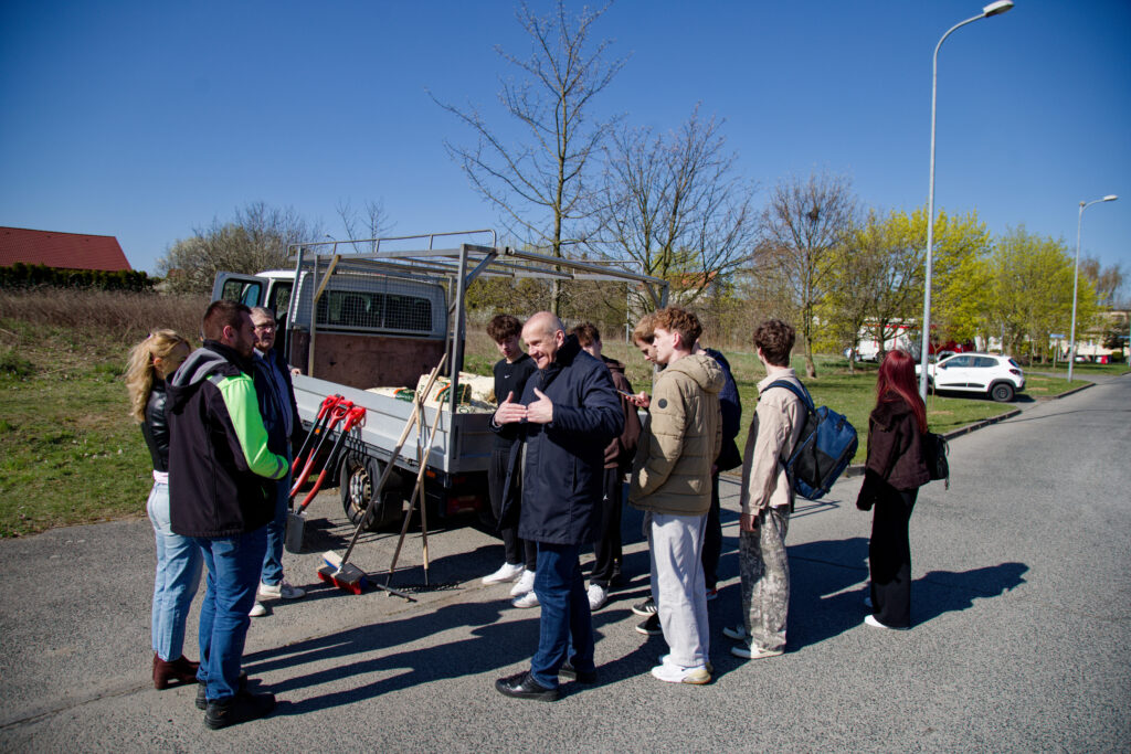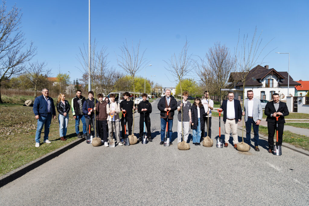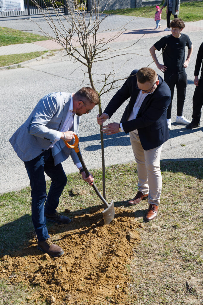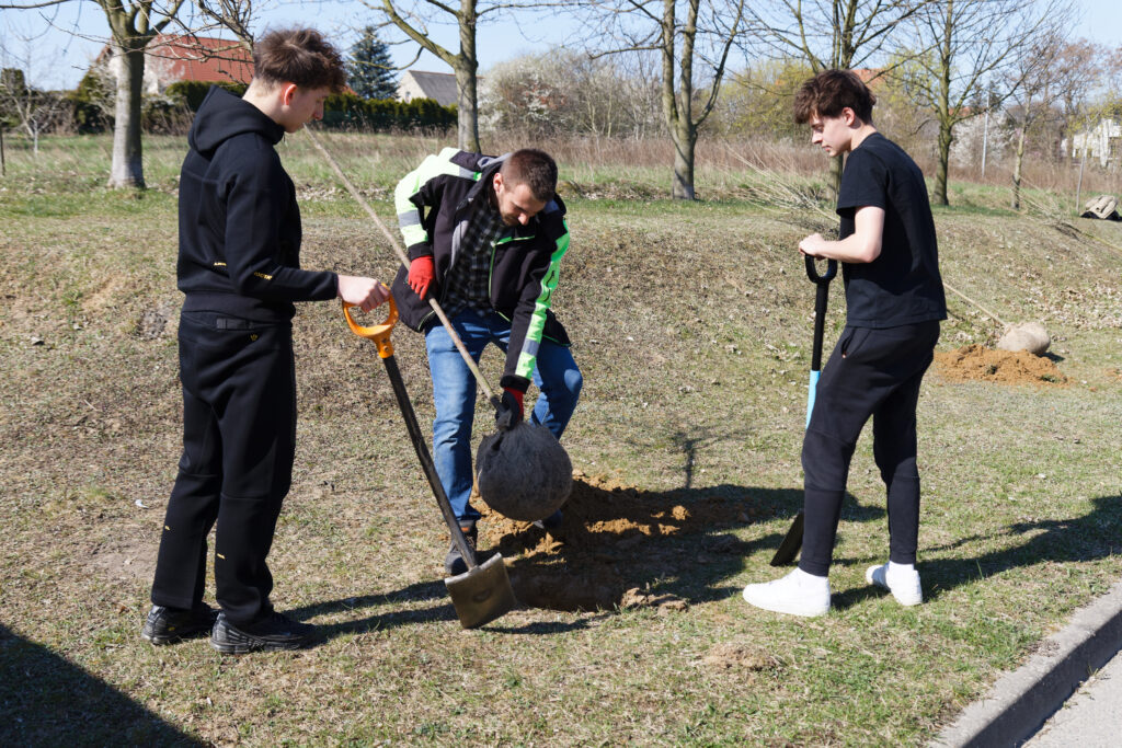 Wspólnymi siłami Pan Kacper Lipiński- Burmistrz Trzemeszna, Pan Zygmunt Nowaczyk- Zastępca Burmistrza, Pan Jarosław Rogalski i Pan Szymon Cegłowski– Zarząd PPZ Trzemeszno sp. z o. o., Pan Mariusz Pisuła- Dyrektor ZSOiZ i Pan Grzegorz Grzegorek, Pracownicy Krochmalni, Pracownicy UM w Trzemesznie, Uczniowie ZSOiZ wspólnie posadzili pierwsze drzewa.